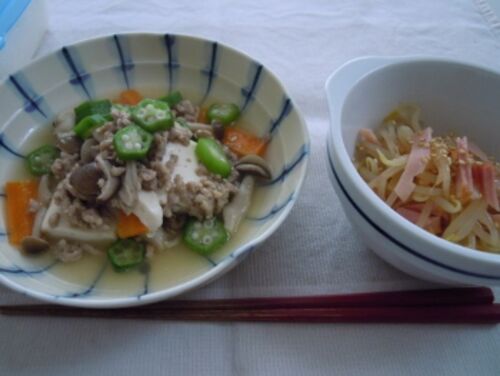 豆腐の野菜うま煮 もやしとハムの中華和え ごはん 朝 ウィンナーと野菜のトマト煮 ドライフルーツ入れたヨーグルト トースト コーヒー